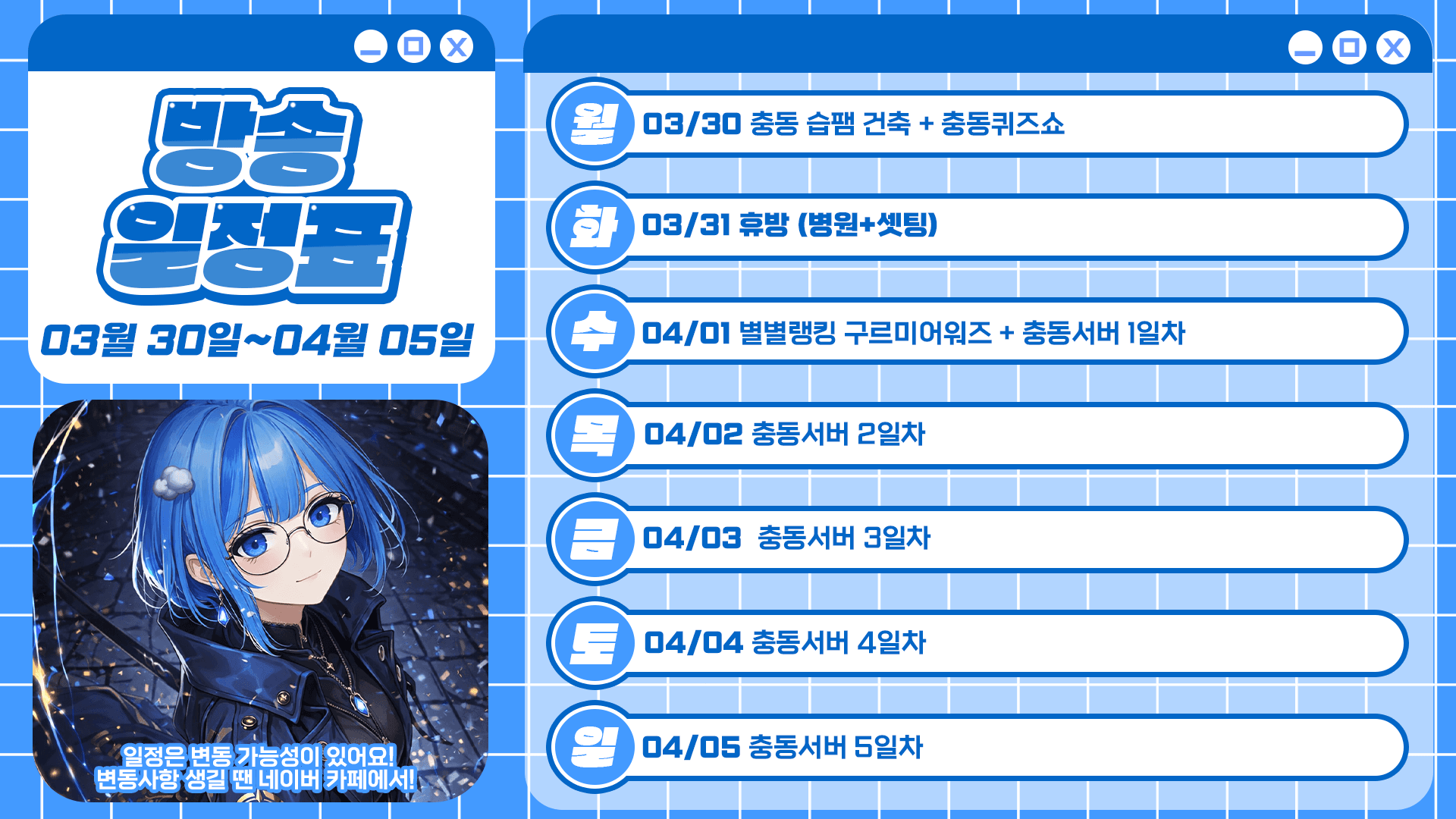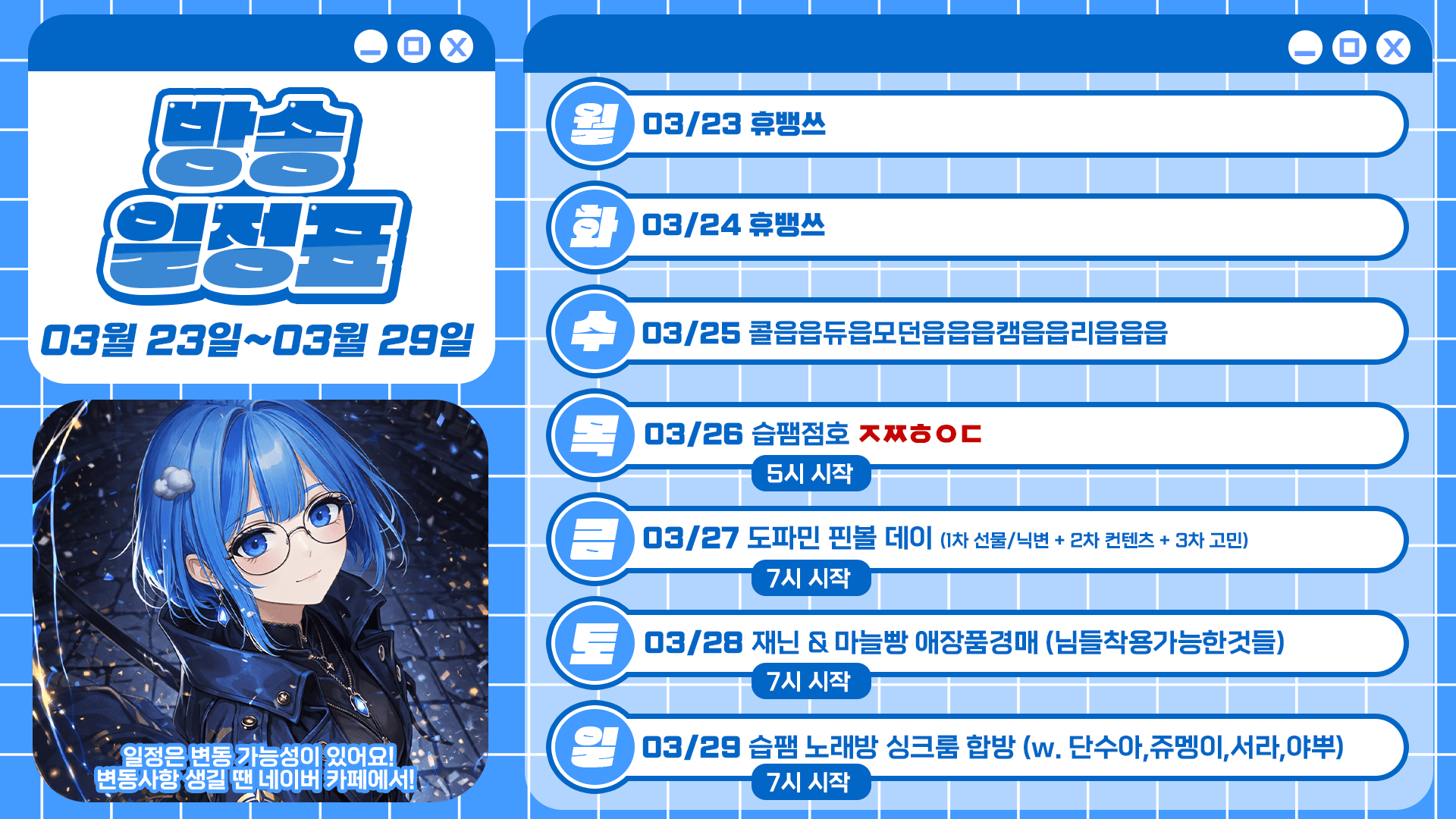 하이하이 이번주 일정표입니당중간중간 투컴셋팅을 위한 몸부림과 수면을 제외하고는최대한 방송이 켜져있을 예정입니다진짜해야하기때문이번주 잘부탁드립니다!화이팅!