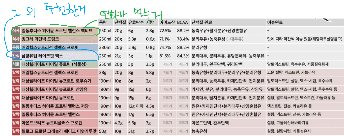 굿닥터님이 정리한 내용이 있더라구 !! 연화가 추천한 2개가 포함되어있고 정리가 잘 되어 있어서 가져왔어 해당 자료는 1년전 거라서 테이크핏의 경우 단백질이 21g에서 24g으로 상향되었고 일동 프밸 액티브는 유효탄수가 조금 늘었지만 1g 정도라 크게 차이가 없어 ! 연화가 추천한거 안심하구 먹어도 된다구 ^-'...